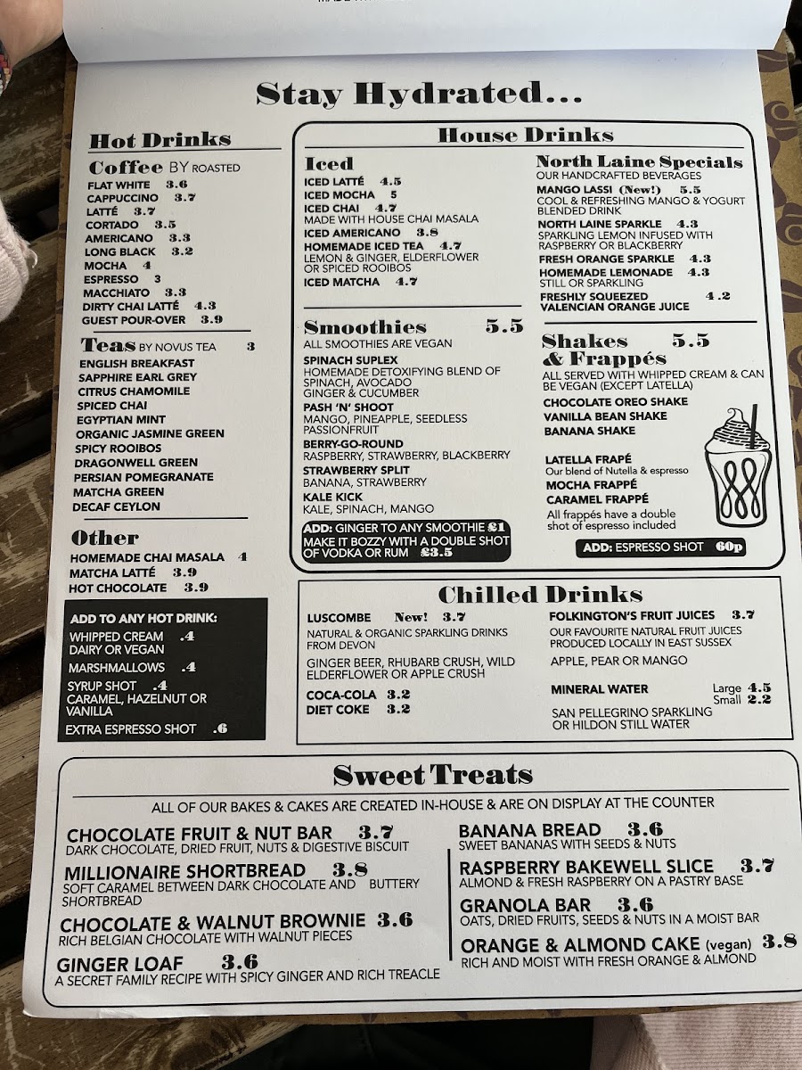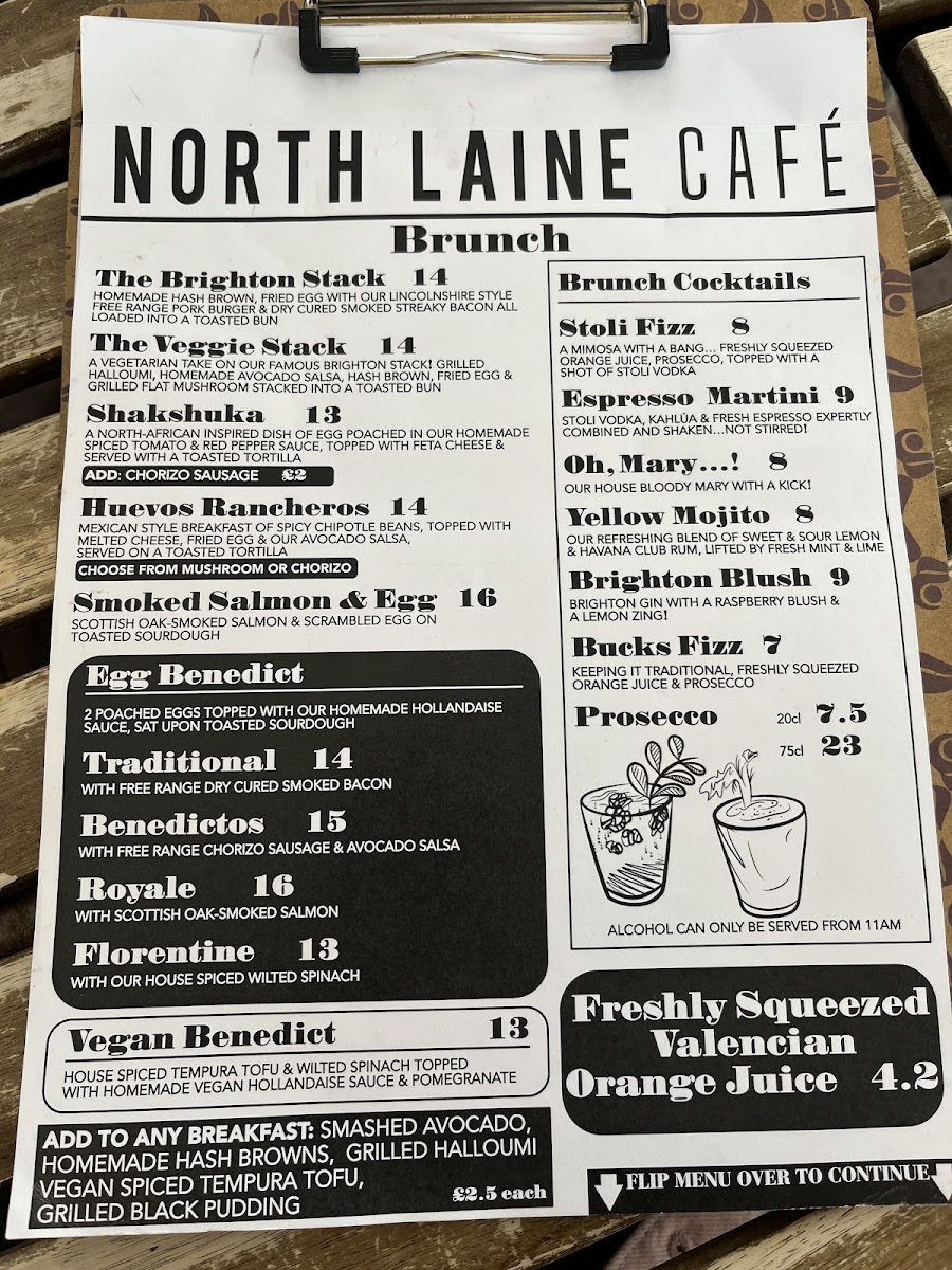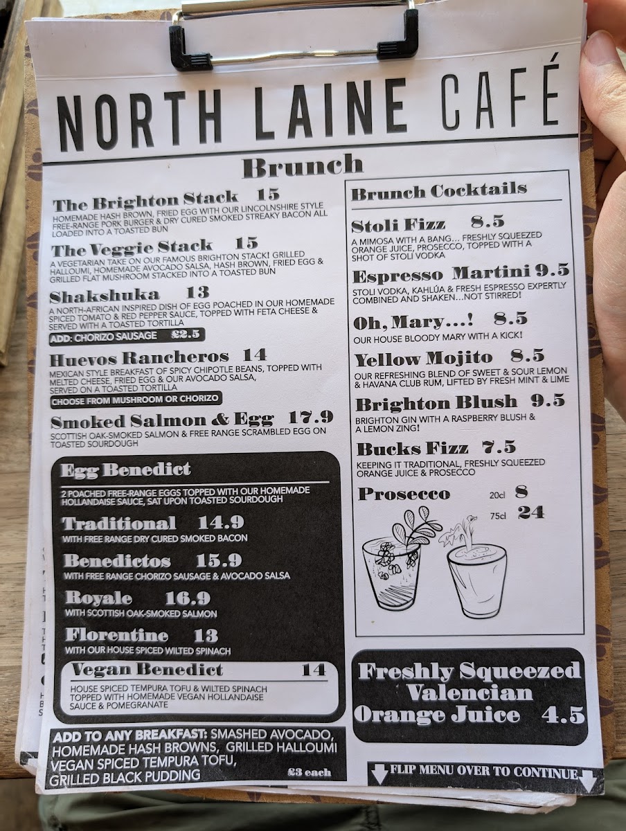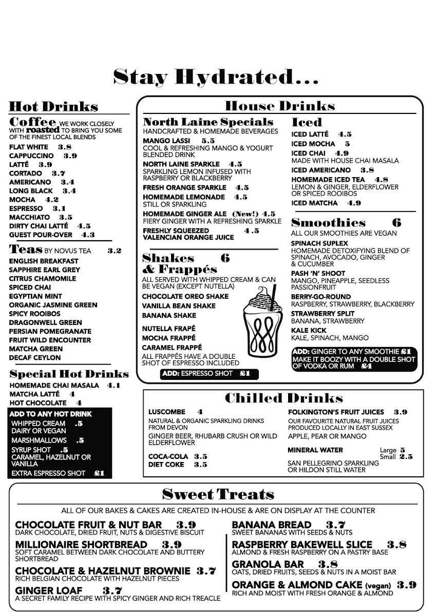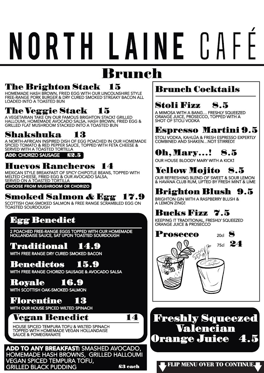 The menu at North Laine Cafe offers an enticing variety of dishes and drinks, catering to all tastes. For brunch lovers, options like The Brighton Stack and The Veggie Stack stand out, alongside flavorful choices like Shakshuka and Huevos Rancheros. Egg Benedict lovers can choose from classics such as Traditional Benedict, Benedictos, or the indulgent Royale and Vegan Benedict. For those seeking something lighter, sandwiches and wraps like the North Laine Club and Halloumi Marvellous provide tasty options. Lunch bowls like the Sweet Potato Buddha and Super Soba Noodle bowl are both filling and nutritious. If you're craving something crispy, their selection of fries includes Skinny Fries, Loaded Fries, and even Sweet Potato Fries. The drink menu is equally diverse, with refreshing beverages like the Mango Lassi, Homemade Lemonade, and vibrant Brighton Blush cocktail. Coffee aficionados can enjoy Iced Latté and Espresso Martini, while tea drinkers will appreciate selections like Citrus Chamomile and Egyptian Mint. For dessert, sweet treats such as the Chocolate & Hazelnut Brownie and Millionaire Shortbread are perfect for satisfying your sweet tooth. Pair any dish with a refreshing drink, whether it's a Prosecco, a crisp Estrella Damm Lager, or a Smoothie like the Pash 'N' Shoot. North Laine Cafe’s menu strikes a wonderful balance between delicious meals, comforting drinks, and indulgent treats, making it an ideal spot for any occasion.