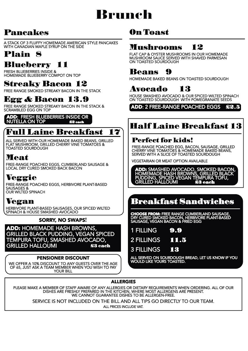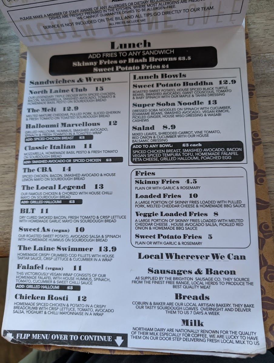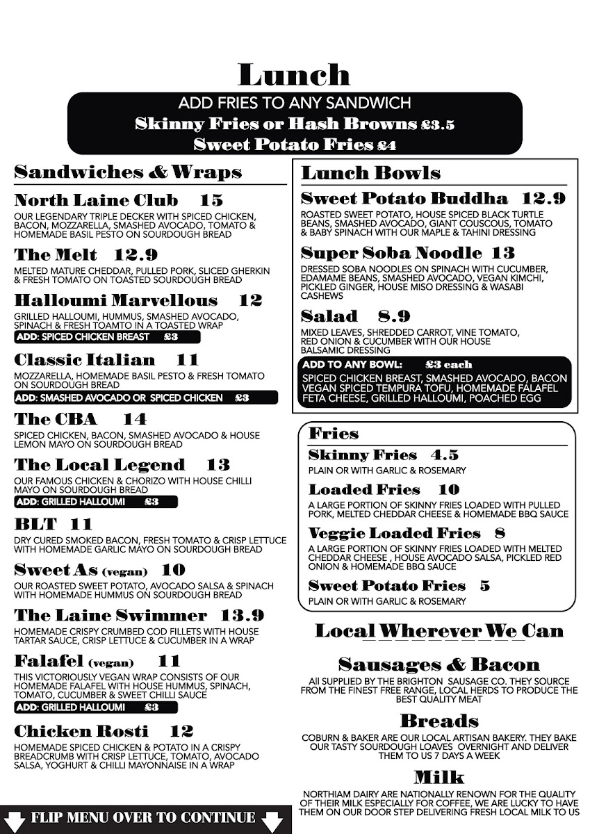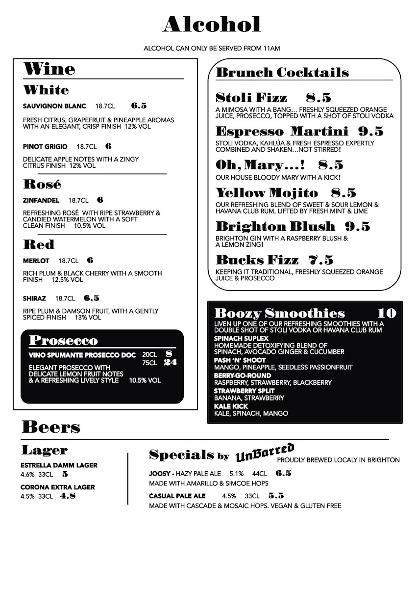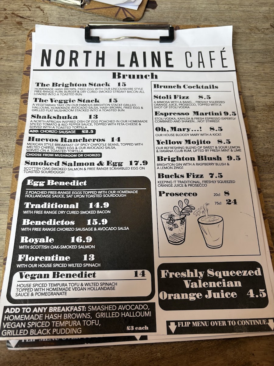 The menu at North Laine Cafe offers an enticing variety of dishes and drinks, catering to all tastes. For brunch lovers, options like The Brighton Stack and The Veggie Stack stand out, alongside flavorful choices like Shakshuka and Huevos Rancheros. Egg Benedict lovers can choose from classics such as Traditional Benedict, Benedictos, or the indulgent Royale and Vegan Benedict. For those seeking something lighter, sandwiches and wraps like the North Laine Club and Halloumi Marvellous provide tasty options. Lunch bowls like the Sweet Potato Buddha and Super Soba Noodle bowl are both filling and nutritious. If you're craving something crispy, their selection of fries includes Skinny Fries, Loaded Fries, and even Sweet Potato Fries. The drink menu is equally diverse, with refreshing beverages like the Mango Lassi, Homemade Lemonade, and vibrant Brighton Blush cocktail. Coffee aficionados can enjoy Iced Latté and Espresso Martini, while tea drinkers will appreciate selections like Citrus Chamomile and Egyptian Mint. For dessert, sweet treats such as the Chocolate & Hazelnut Brownie and Millionaire Shortbread are perfect for satisfying your sweet tooth. Pair any dish with a refreshing drink, whether it's a Prosecco, a crisp Estrella Damm Lager, or a Smoothie like the Pash 'N' Shoot. North Laine Cafe’s menu strikes a wonderful balance between delicious meals, comforting drinks, and indulgent treats, making it an ideal spot for any occasion.